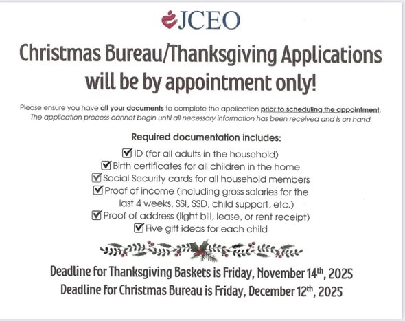 If you or someone you know is in need of support this holiday season, please contact our JCEO representative, Renee, as soon as possible to ensure your application is submitted before the deadline.